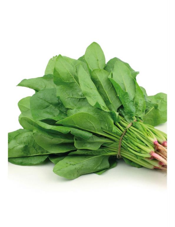 Spinacia oleracea.Planta de hojas lanceoladas, carnosas de grandes dimensiones, de color verde medio claro y de pecíolo largo.