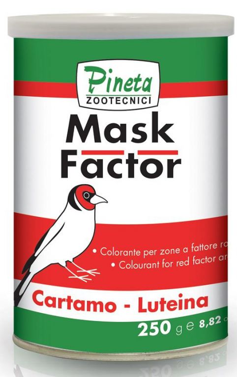 MASK FACTORPigmentante para zonas a factor rojoAumenta el lipocromo de las áreas rojasMASK FACTOR es un pigmentante basado en sustancias naturales como la luteína y las flores de cártamo indispensables para obtener una coloración intensa y natural en el plumaje. Su particular composición favorece la correcta pigmentación y brillo de áreas restringidas como, por ejemplo, las máscara de los jilgueros, la cabeza, el mentón y la frente de los pardillos sizerines. Contiene, también, extractos secos de silimarina (cardo mariano), diente de león y equinácea que ayudan al organismo durante el período de muda, actúan en el hígado con un efecto desintoxicante y hepatoprotector y contribuyen a fortalecer las defensas inmunitarias. La cantaxantina no está presente, porque es posiblemente responsable de la coloración no deseada de las partes no rojas. Por lo tanto, si se usa correctamente, MASK FACTOR actúa solo en las áreas rojas naturales y no mancha el plumaje.Informaciones adicionales: RECOMENDADO usar a partir de la separación de los pichones de los padres. Para realzar el lipocromo rojo en Carduelis, Spinus y especies con áreas de plumaje rojo, como camachuelos y piquituertos comunes.Modo de Empleo. Uso: mezclar cuidadosamente con una pasta mórbida. Dosis: 10-15 g por kg de alimento. Duración del tratamiento: administrar a días alternos, desde el destete (emplumece) hasta muda completada.Composición – Categorías de ingredientes: productos de panadería y de fabricación de pastas alimenticias, otras plantas, algas y sus productos derivados (flores secas de cártamo, extracto de equinácea), otras semillas, frutos y sus productos derivados (extracto de cardo mariano – silimarina), tubérculos, raíces y sus productos derivados (extracto de diente de león – raíces).Aditivos tecnológicos: conservantes, antioxidantes.Aditivos organolépticos: luteína (e161b)