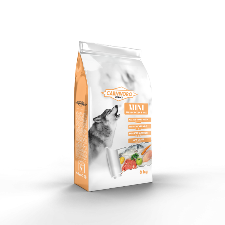 Carnívoro Mini esta dirigido a perros adultos de razas pequeñas o Mini que no superen los 10 kg.Las recetas de Carnívoro estan fabricadas en España, con ingredientes naturales aptos para el consumo humano, proporcionados por suministradores locales.Ingredientes: Carne de Pollo deshidratada 28%, Pollo Fresco braseado 20%, Arroz Integral 16%, Lentejas 14%, Grasa de Pollo, Algarroba, Aceite de Salmón, Glucosamina, Condroitina y Probióticos.