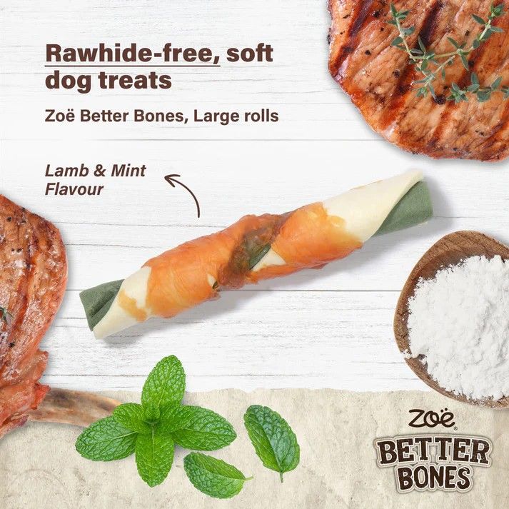 Rollitos grandes de rollo de menta y cordero Zoe Better Bones para perrosA los perros les encanta masticar, pero el cuero crudo tradicional puede causar asfixia y problemas digestivos. La gama Better Bones es segura de masticar, fácil de digerir y ayuda a mantener dientes y encías saludables. Hechas con pollo real e ingredientes de fácil digestión, las golosinas blandas sin cuero crudo brindan una alternativa saludable para los perros. Combinando sabores irresistibles con bondad masticable, Better Bones satisface el instinto de masticación natural de un perro y promueve una buena higiene bucal.Composición: COMPOSICIÓN: Almidón de tapioca, filete de pollo (25,9%), glicerina, sorbitol líquido, proteína de soja aislada, almidón de maíz, goma xantana, aceite de girasol, carbonato de calcio, menta en polvo (0,1%), aroma de cordero (0,1%), celulosa.ADIZANTES: Emulsionante, aromas, colorantes, conservantes.Componentes analíticos: Humedad 10,2%, Proteína 21%, Fibra Bruta 0,2%, Contenido de Grasa 4,6%, Materia Inorgánica 1,8%Aditivos: Emulgente, Aromas, Colorantes, Conservantes.