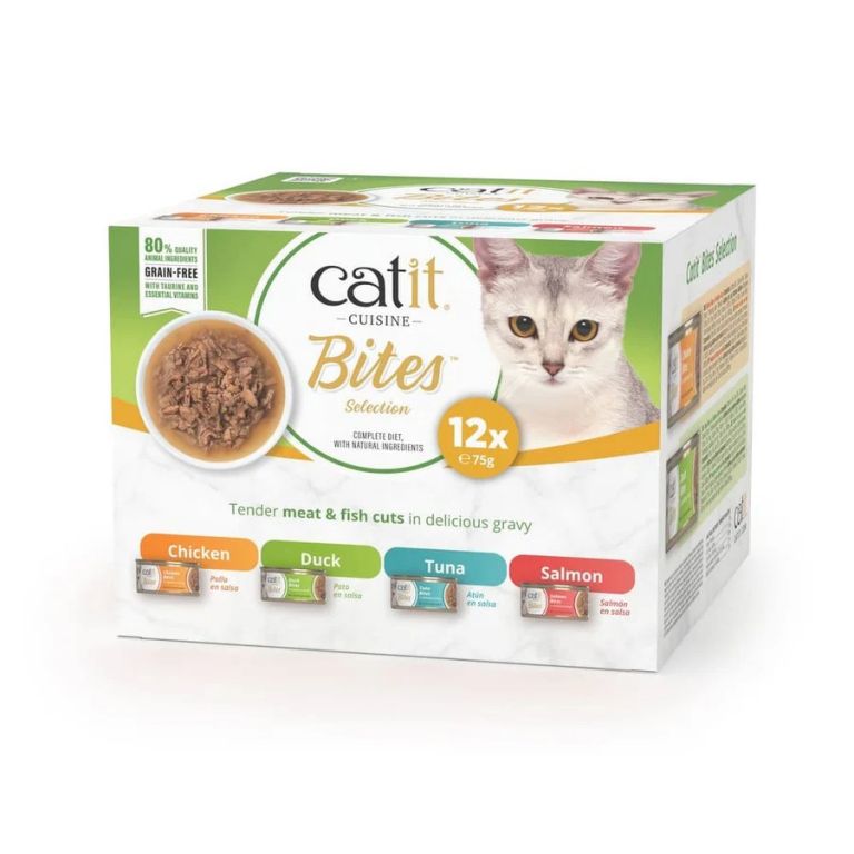 CaracterísticasCatit Bites ofrece tiernas partes del tamaño de un bocado, perfectas para gatos que prefieren una comida más carnosa. Los bocados suaves y jugosos en una deliciosa salsa proporcionan comodidad y nutrición, ofreciendo un plato sin cereales con una textura satisfactoria que hará que tu gato quiera repetir.Elaborado con un 80 % de ingredientes animales de calidad.Tiernos bocados de carne o pescado de primera calidad.Deliciosa y rica salsa.Sin cereales.Con taurina y vitaminas esenciales.Disponible en 4 variedades.Información nutricionalCatit Cuisine Bites - PolloComposición: Pollo 80 %, caldo de pollo, almidón de tapioca, espesante, minerales. Aditivos: Aditivos nutricionales (por kg): manganeso 2,5 mg, zinc 5 mg, cobre 2,8 mg, vitamina A 1000 UI, vitamina D3 100 UI, taurina 500 mg. Aditivos tecnológicos (por kg): goma cassia 2900 mg. Componentes analíticos: Proteína bruta 12 % | Grasa 2,5 % | Fibra bruta 0,05 % | Ceniza bruta 2,5% | Humedad 82 %.----Catit Cuisine Bites - PatoComposición: Pollo 54 %, pato 26 %, caldo de pollo, almidón de tapioca, espesante, minerales.Aditivos: Aditivos nutricionales (por kg): manganeso 2,5 mg, zinc 5 mg, cobre 2,8 mg, vitamina A 1000 UI, vitamina D3 100 UI, taurina 500 mg. Aditivos tecnológicos (por kg): goma cassia 2900 mg. Componentes analíticos: Proteína bruta 12 % | Grasa 2,5 % | Fibra bruta 0,05 % | Ceniza bruta 2,5% | Humedad 82 %.----Catit Cuisine Bites - AtúnComposición: Pollo 54 %, atún 26 %, caldo de pollo, almidón de tapioca, espesante, minerales. Aditivos: Aditivos nutricionales (por kg): manganeso 2,5 mg, zinc 5 mg, cobre 2,8 mg, vitamina A 1000 UI, vitamina D3 100 UI, taurina 500 mg. Componentes analíticos: Proteína bruta 12 % | Grasa 2,5 % | Fibra bruta 0,05 % | Ceniza bruta 2,5% | Humedad 82 %.----Catit Cuisine Bites - SalmónComposición: Pollo 54 %, salmón 26 %, caldo de pollo, almidón de tapioca, espesante, minerales. Aditivos: Aditivos nutricionales (por kg): manganeso 2,5 mg, zinc 5 mg, cobre 2,8 mg, vitamina A 1000 UI, vitamina D3 100 UI, taurina 500 mg. Componentes analíticos: Proteína bruta 12 % | Grasa 2,5 % | Fibra bruta 0,05 % | Ceniza bruta 2,5% | Humedad 82 %.----Guía de alimentación: Como guía, dale 2 latas al día a un gato adulto de 4 kg. Ajusta la cantidad según la edad, el peso y el nivel de actividad. Sirve a temperatura ambiente. Deja agua fresca a tu gato a su disposición en todo momento.Guía de almacenamiento: Guardar en un lugar fresco y seco. Una vez abierto, refrigerar y consumir en 48h.