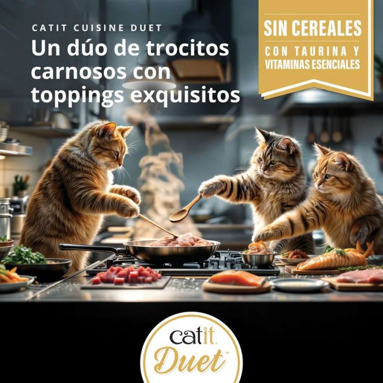 CaracterísticasCatit Cuisine Duet lleva la hora de la comida a un nuevo nivel con una combinación perfecta de Catit Bites cubiertos con carne o marisco de primera calidad. Este festín de dos texturas está elaborado con un 80 % de ingredientes animales de primera calidad y rico en taurina y vitaminas esenciales. Sin cereales y lleno de sabor, Catit Duet es una deliciosa opción para todos los días.Con un 80 % de ingredientes animales de calidadCatit Bites con un sabroso recubrimiento de carne o marisco de calidadSalsa deliciosa y sabrosaSin cerealesCon taurina y vitaminas esencialesApetitoso para todos los gatos gracias a sus texturas y sabores contrastadosDisponible en 4 variedadesInformación nutricionalCatit Cuisine Duet - Pollo con gambasComposición: Pollo 76 %, caldo de pollo, gambas 4 %, almidón de tapioca, espesante, minerales. Aditivos: Aditivos nutricionales (por kg): manganeso 2,5 mg, zinc 5 mg, cobre 2,8 mg, vitamina A 1000 UI, vitamina D3 100 UI, taurina 500 mg. Aditivos tecnológicos (por kg): goma cassia 2900 mg. Componentes analíticos: Proteína bruta 12 % | Grasa 2,5 % | Fibra bruta 0,05 % | Ceniza bruta 2,5% | Humedad 82 %.----Catit Cuisine Duet - Pato con pechuga de polloComposición: Pollo 54 % (mín. 4 % pechuga de pollo), pato 26 %, caldo de pollo, almidón de tapioca, espesante, minerales.Aditivos: Aditivos nutricionales (por kg): manganeso 2,5 mg, zinc 5 mg, cobre 2,8 mg, vitamina A 1000 UI, vitamina D3 100 UI, taurina 500 mg. Aditivos tecnológicos (por kg): goma cassia 2900 mg. Componentes analíticos: Proteína bruta 12 % | Grasa 2,5 % | Fibra bruta 0,05 % | Ceniza bruta 2,5% | Humedad 82 %.----Catit Cuisine Duet - Atún con salmónComposición: pollo 50 %, atún 26 %, caldo de pollo, salmón 4 %, almidón de tapioca, espesante, minerales. Aditivos: Aditivos nutricionales (por kg): manganeso 2,5 mg, zinc 5 mg, cobre 2,8 mg, vitamina A 1000 UI, vitamina D3 100 UI, taurina 500 mg. Aditivos tecnológicos (por kg): goma cassia 2900 mg. Componentes analíticos: Proteína bruta 12 % | Grasa 2,5 % | Fibra bruta 0,05 % | Ceniza bruta 2,5% | Humedad 82 %.----Catit Cuisine Duet - Salmón con pechuga de polloComposición: Pollo 54 % (mín. 4 % pechuga de pollo), salmón 26 %, caldo de pollo, almidón de tapioca, espesante, minerales. Aditivos: Aditivos nutricionales (por kg): manganeso 2,5 mg, zinc 5 mg, cobre 2,8 mg, vitamina A 1000 UI, vitamina D3 100 UI, taurina 500 mg. Aditivos tecnológicos (por kg): goma cassia 2900 mg. Componentes analíticos: Proteína bruta 12 % | Grasa 2,5 % | Fibra bruta 0,05 % | Ceniza bruta 2,5% | Humedad 82 %.----Guía de alimentación: Como guía, dale 2 latas al día a un gato adulto de 4 kg. Ajusta la cantidad según la edad, el peso y el nivel de actividad. Sirve a temperatura ambiente. Dale agua fresca a tu gato a su disposición en todo momento.Guía de almacenamiento: Guardar en un lugar fresco y seco. Una vez abierto, refrigerar y consumir en 48h.