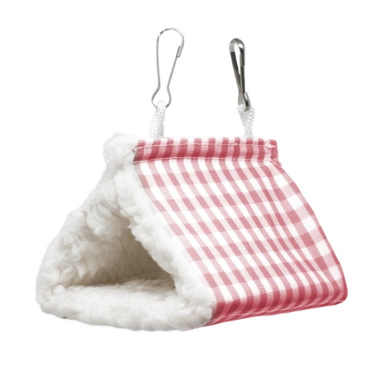 Casita refugio con enganches superiores para colgar, fabricada en materiales suaves y cálidos ideal para pequeñas aves y roedoresCaracterísticas:Enganches de metal fuertes y seguros.Materiales cómodos para dormir y descansar.Proporciona refugio y un lugar de juego.Disponible en colores rojo y verd