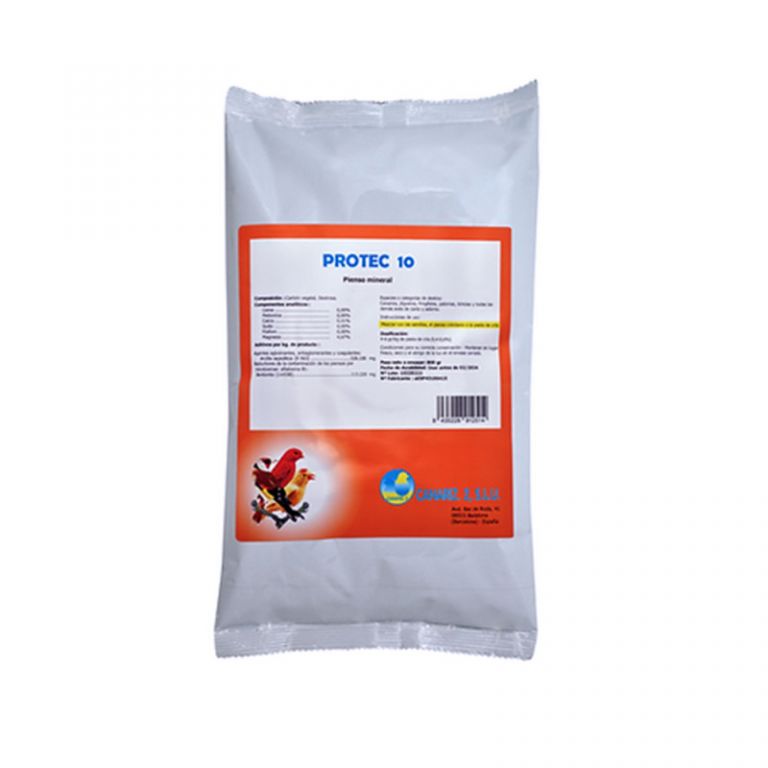 Descripción PROTEC 10 Antifúngico y antibacteriano en polvo, protege a las aves de los problemas de hongos y bacterias en las semillas, pienso y pasta de cría. Con un efecto fortalecedor general, protegiendo el intestino de las aves, actuando como preventivo y evitando que las aves enfermen. Modo de empleo Mezclar con las semillas, el pienso cotidiano o la pasta de cría. Dosificación: 4-6gr./kg. de pasta de cría, semillas, pienso. Envase: 800g;