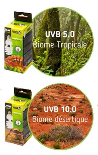 Las la´mparas UVB permiten a los reptiles producir vitamina D3 fundamental para la absorcio´n de calcio.Esta la´mpara se adapta a las especies dese´rticas.La radiacio´n UVB es filtrada por el vidrio, por lo que es importante colocar la bombilla correctamente.La potencia watt ayudara´ a elegir el alcance de la bombilla.Incluso si las la´mparas calientan poco, se recomienda colocarlas en el portala´mparas E27 de cera´mica.En caso de un uso regular de 10 a 12 horas al di´a, se recomienda cambiar la bombilla cada 6 meses.