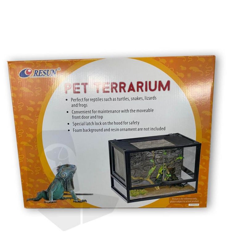Terrario para pequeños Reptiles con cierre de seguridad y tapa con rendijas 43,8×27,8x34cmEl terrario horizontal de vidrio Resun PT-400 es un hogar adecuado para pequeños anfibios, reptiles o insectos.La tapa superior y la puerta frontal móviles permiten un mantenimiento o alimentación sencillos.Gracias a la rejilla de ventilación, el terrario puede ventilarse fácilmente